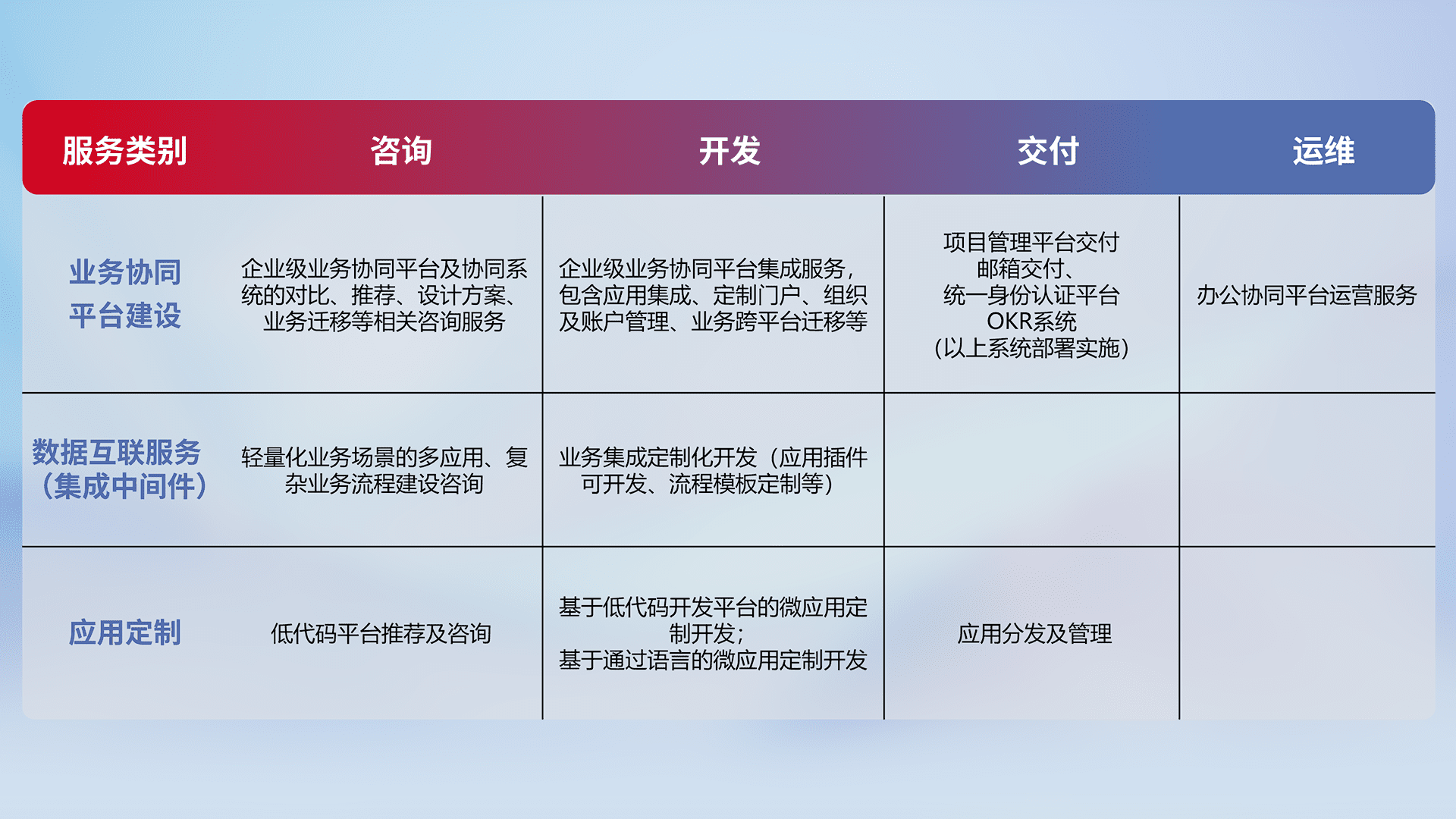 针对钉钉、、、、企微、、IDaas等平台级产品提供产品的规划、、方案、、交付、、、定制化开发等服务,,,实现如统一协同办公、、、、智能客户服务、、、混合会议管理、、、智能数据查询、、、等业务场景,,,,实现数字化转型。。
