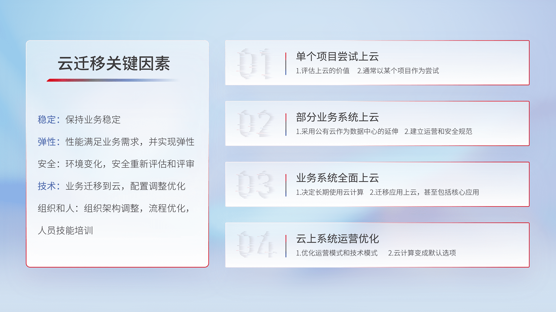 结合实际业务,,从规划设计、、云平台选型、、、、云原生改造、、数据迁移、、、集成交付,,,迁移全过程为客户识别最佳上云路径,,,做好风险识别管理,,,设计网络架构、、身份权限、、安全审计合规、、、操作审计、、日志审计、、监控告警策略、、、多站点容灾设计等,,,,对云上基础设施进行整体规划,,,提升IT治理水平,,,以满足弹性、、、、高可用、、、高性能的需求。。