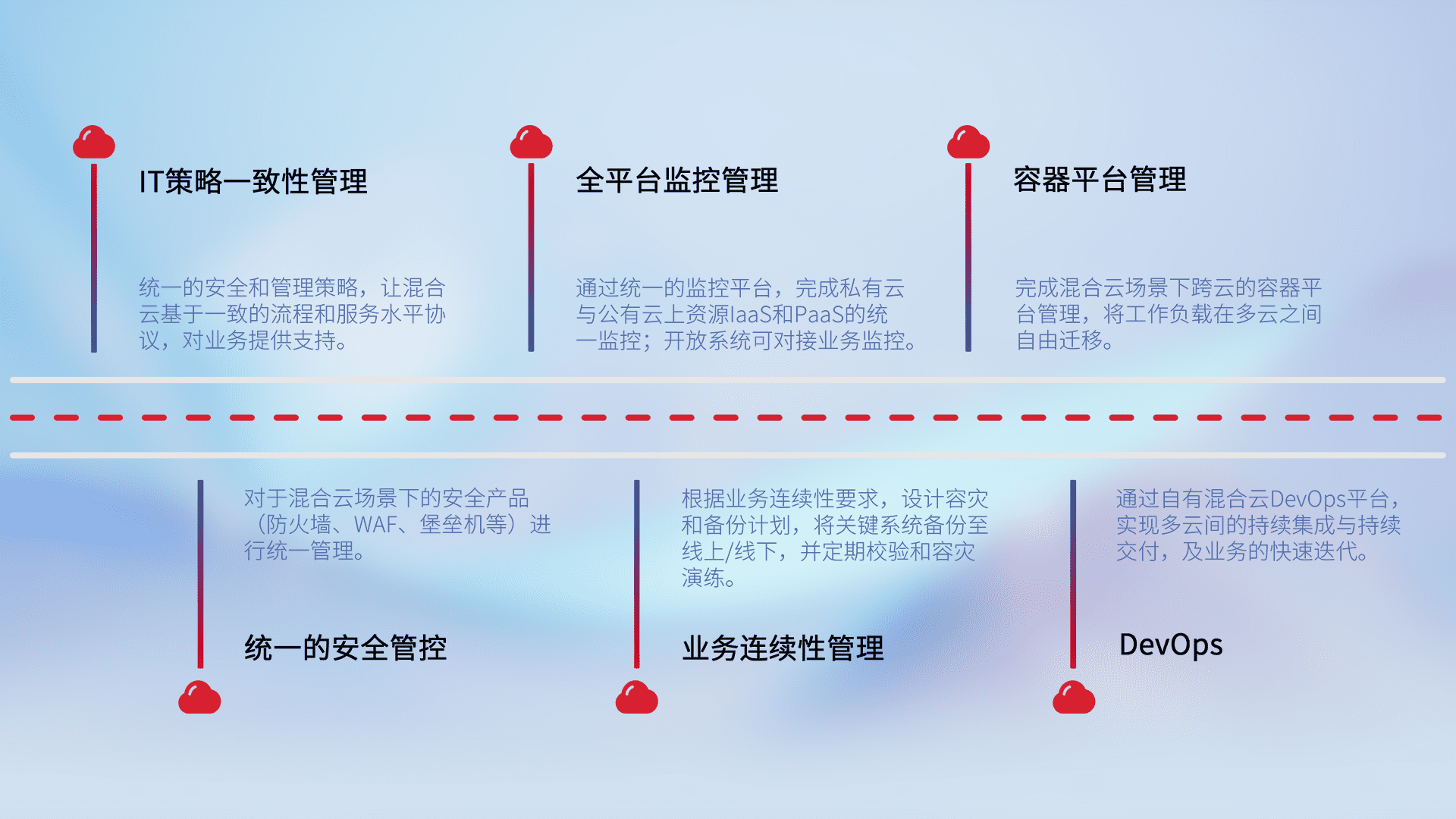 通过多云纳管,,以统一的资源数据模型把客户的云资源进行抽象和封装,,,,进而实现对多云资源的统一操作,,保障云资源管理的可靠性、、、、稳定性与可用性。。。。量身定制化运维内容,,,,配置、、开发运维、、、、补丁管理、、、、备份、、监控、、、、认证和访问管理、、、审计和日常巡检等,,,保障在用云过程中的可靠度,,,,稳定度以及高可用率。。。